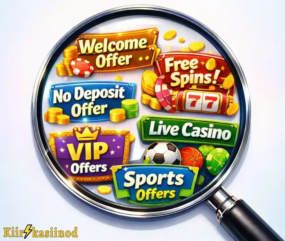 Kui ma veebikasiinodes ringi vaatan, näen, et kasiinopakkumised jagunevad üsna loogilisteks gruppideks. On tervituspakkumised, mis on suunatud uutele mängijatele; on kampaaniad, mis seotud konkreetse mängu või tootjaga; on lojaalsus- ja VIP-programmid; hooajalised kampaaniad ning lisaks eraldi spordi- ja live-kasiino diilid.